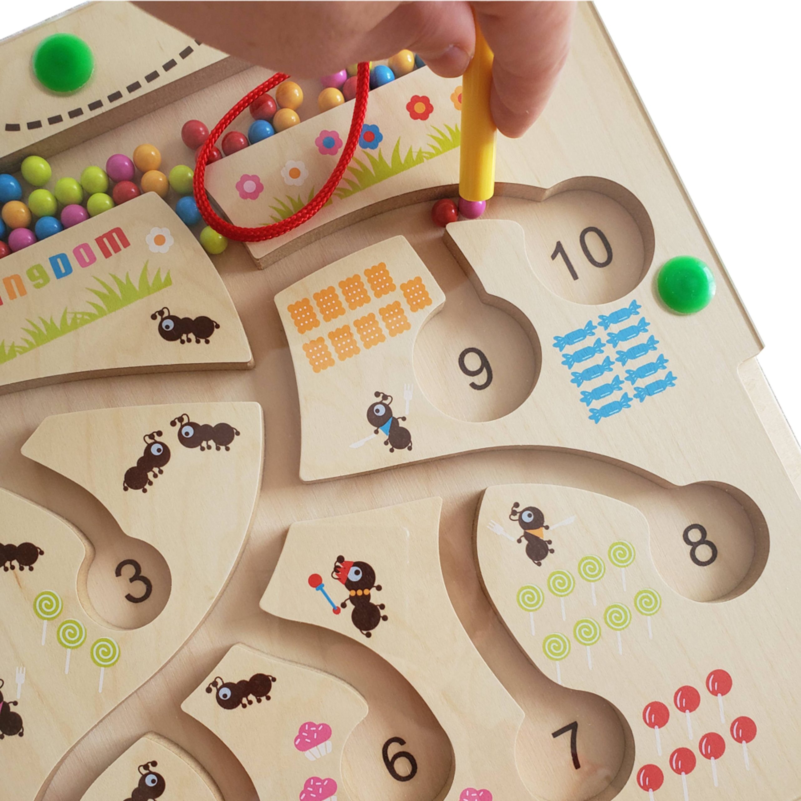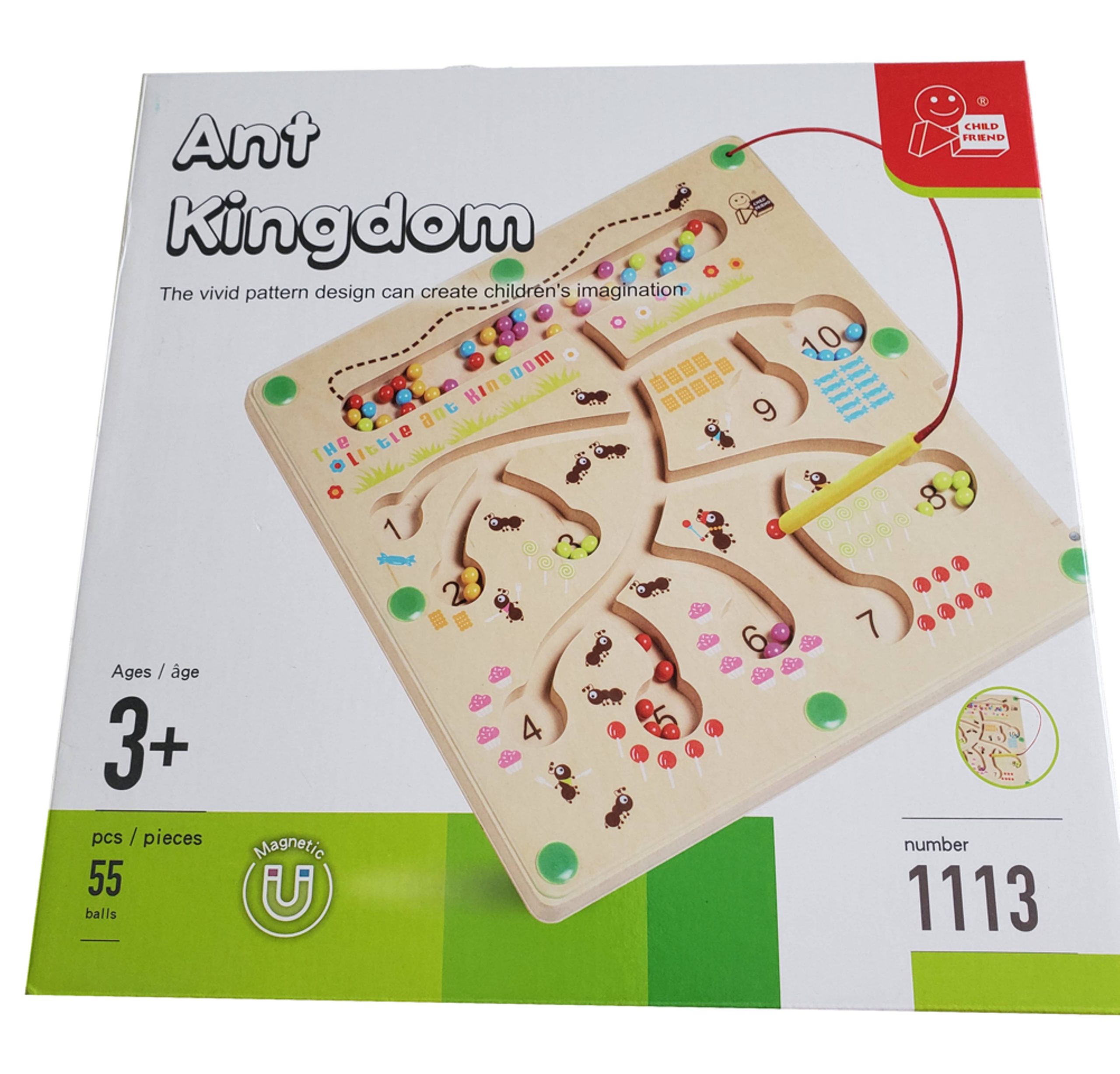 Ant Kingdom er en magnetisk labyrint, som hjælper dit barn med at lære at tælle og sortere farver, samt udvikler finmotorikken. Labyrinten er lavet i træ og har en plastskærm monteret, hvorpå barnet bevæger den magnetiske pen. Labyrinten har mange “udgange” eller slutpunkter, som er markeret med forskellige farver og antal myrer. Spillet går ud på at barnet flytter det nødvendige antal kugler med en bestemt farve hen til slutpunktet, hvor de hører til. Derved lærer børnene at tælle og genkende farverne. Supplerer man spillet med en beskrivelse af hvad der sker (f.eks. “Nu flytter du den grønne kugle”), udvikles også barnets sprog. Endnu et plus ved den magnetiske labyrint er, at barnet lærer at holde om pennen. Det er nemlig samme greb, som man bruger, når man skriver eller tegner.